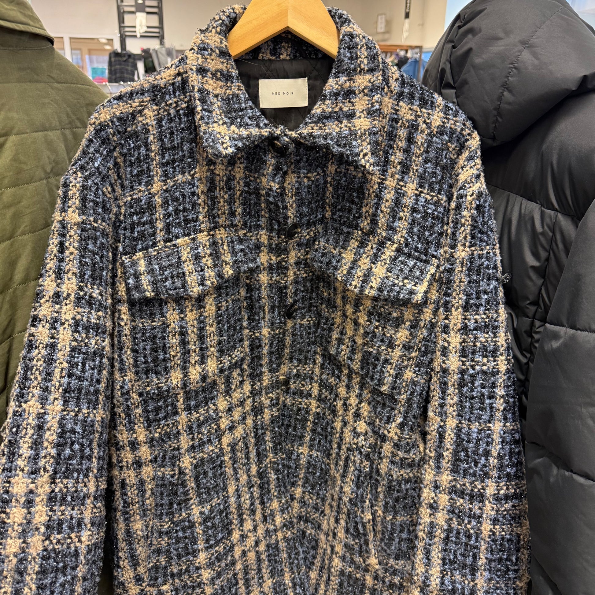 Neo Noir jakke med grafisk mønster i sort, hvid og blå. Lavet i 100% polyester for en let og behagelig følelse. Jakken er i som ny stand og har en normal pasform, perfekt til at tilføre dit outfit et moderne touch.